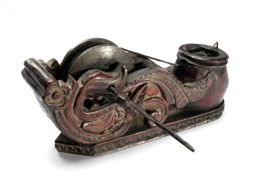 광대한 중국에서는 다양한 형태의 먹 항아리를 볼 수 있다.그들은 구조나 형상에서 엉덩이 할형, 한쪽 팔형, 양팔 폐쇄형, 바닥부 폐쇄형으로 분류할 수 있다.저부 폐쇄형은 한층 더 (a) 세련된 모양(b) 한 문자형(c) 모습 조각형 등으로 나눌 수 있다.사진은 기세형으로 분류할 수 있는 먹항아리로, 유려한 조각과 전체의 조형이 훌륭하게 디자인되어 있다.