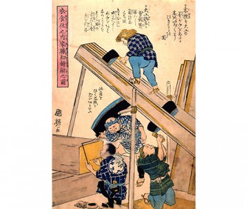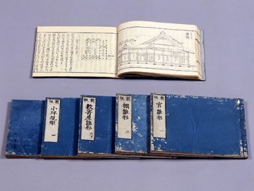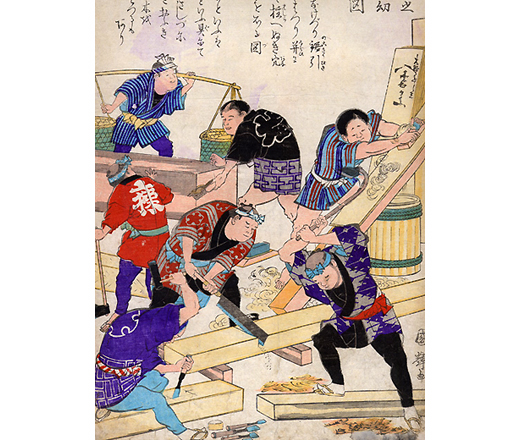 학동용의 해설도로서 메이지 초년에 문부성으로부터 출판된 도집.에도 말기부터 메이지 초기에 걸친 장인들의 모습이 생생하게 그려져 있다.목마비가 앞면 큰 톱을 이용해 제재하는 모습이나 목수가 각재에 먹을 붙이는 모습이 그려져 있다.