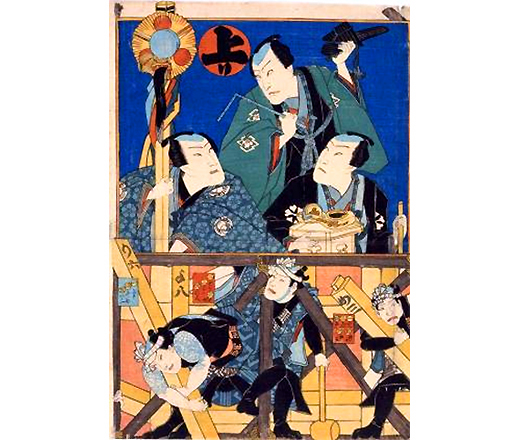 대들보 올리기의 모습을 쌍육 형식으로 그린 다색 인쇄 목판화총 5개 중 1개.에도시대에 있어서의 목수의 풍속을 이해할 수 있다.하부에는 건방(조상)의 모습, 상부에는 의식을 실시하는 목수의 모습이 그려져 있다.