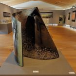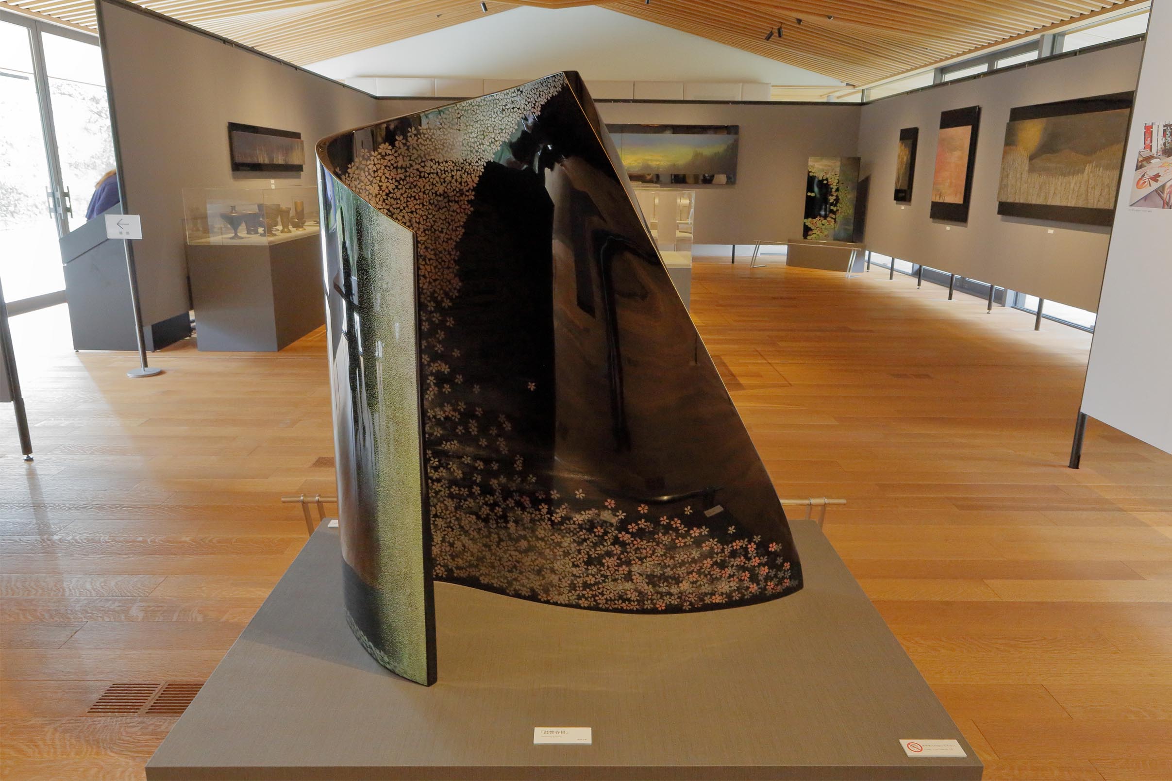 높이 1미터를 넘는 「고향 봄기(코쿄슈키)」.침금으로 세세하게 물들여진 벚꽃의 꽃잎이 요염한 옻나무의 경면에 비추어져 꽃잎이 흩날리는 모습이 훌륭하게 표현된 작품입니다.이것은 일년이 걸려 제작되었다고 합니다만, 이 작품을 계기로 옻칠에 색채를 도입하고 싶다고 생각하게 되었다고 합니다. |