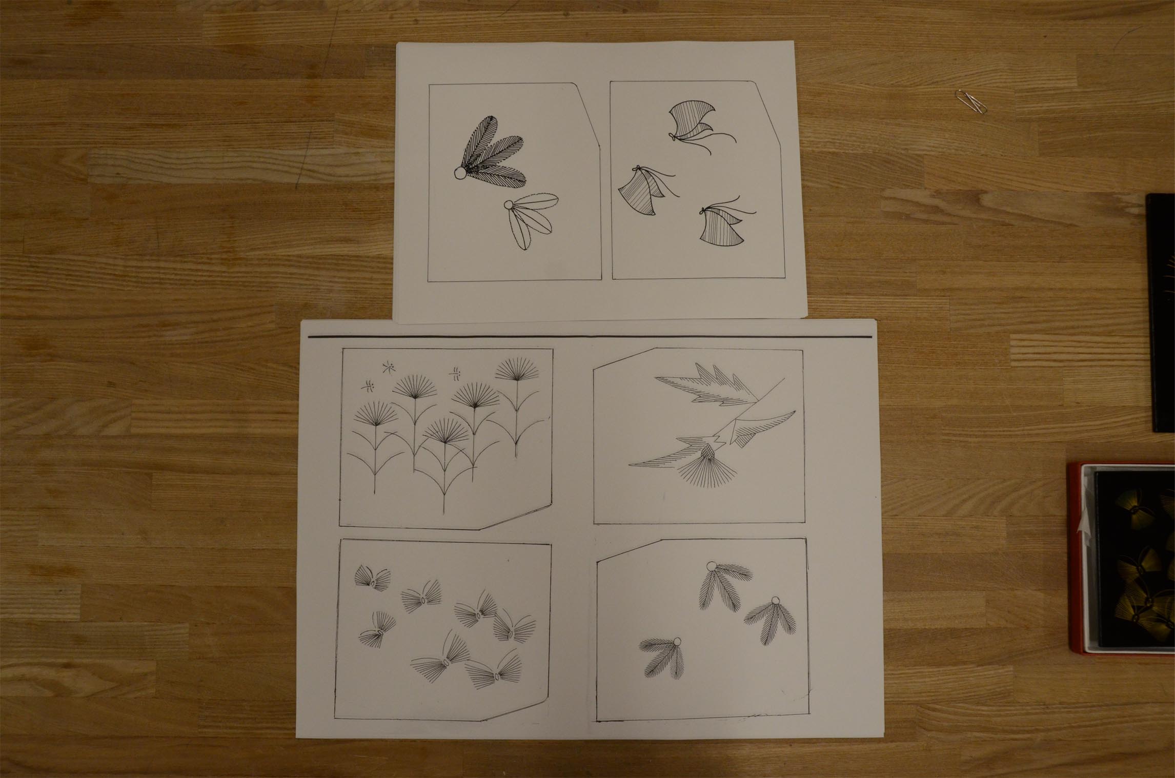 심금의 최초의 공정은 「두림 만들기」.칠공에서는 도안을 두는목(오키메)라고 합니다.우선 도안을 선택해 트레이스 종이에 그려 갑니다.초보자를 위해 조각하기 쉬운 6종류의 도안이 준비되었습니다.물론 직접 디자인할 수도 있습니다.곡선을 조각하는 것은 매우 어렵기 때문에 초보자는 직선을 기본으로 구성한 도안이 좋다고 합니다.침금도로 생각한 대로의 선을 조각하기까지는 최소 6~7년은 걸립니다. |