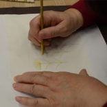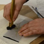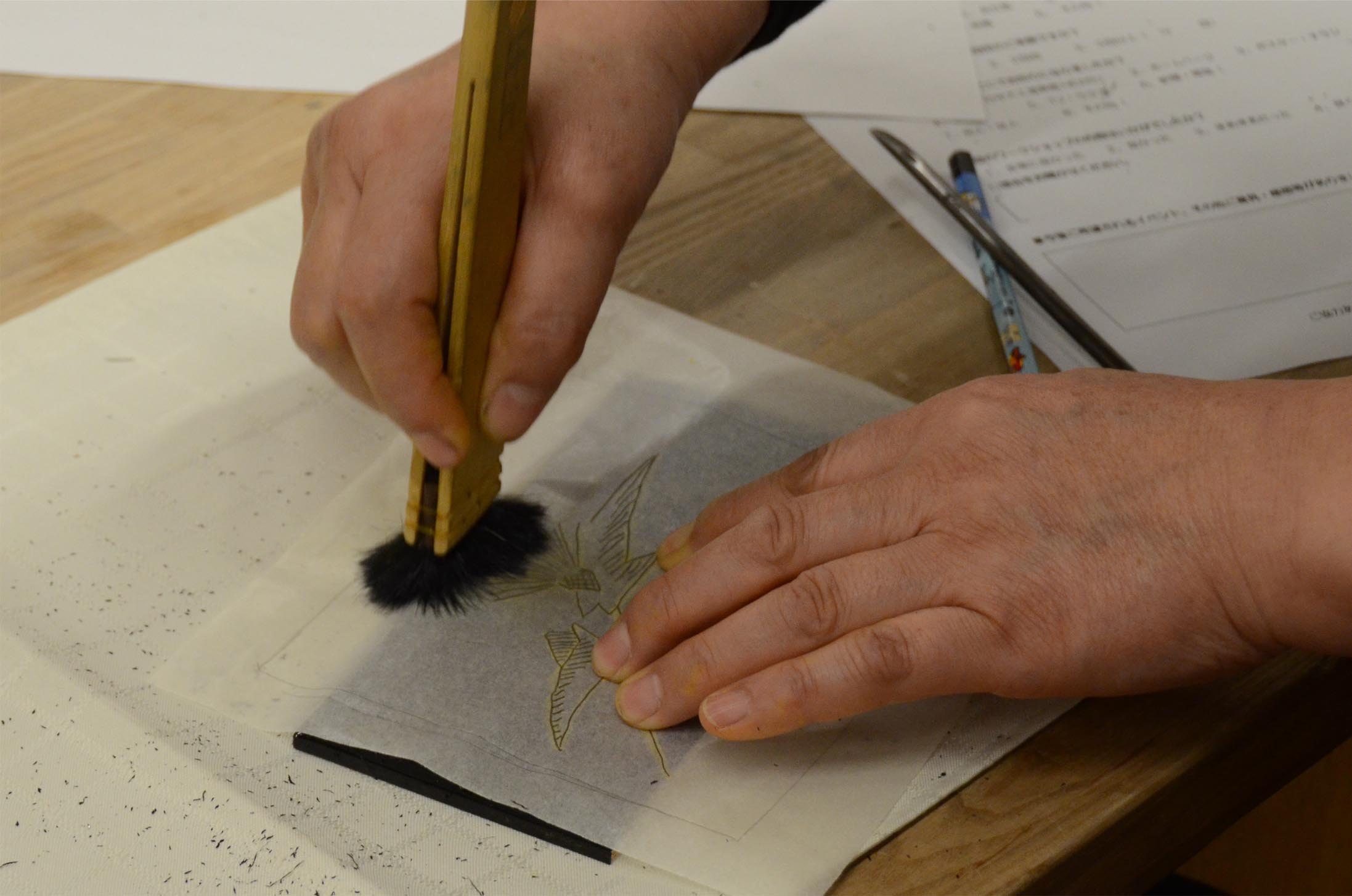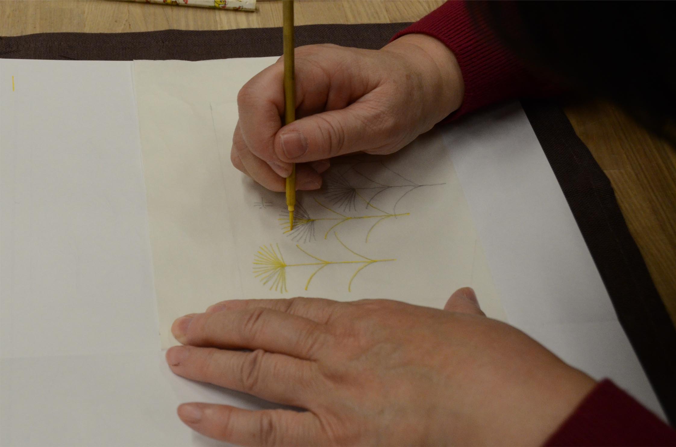 도안을 그린 트레이스 종이 뒤에서 노란 가루로 수수께끼, 인쇄모로 눌러 도안을 접시에 옮겨 갑니다 |