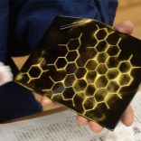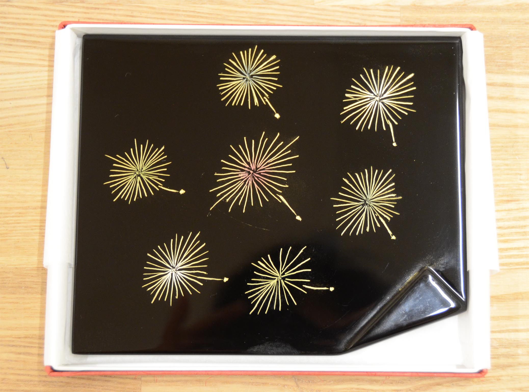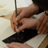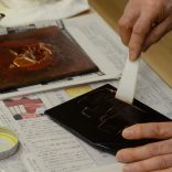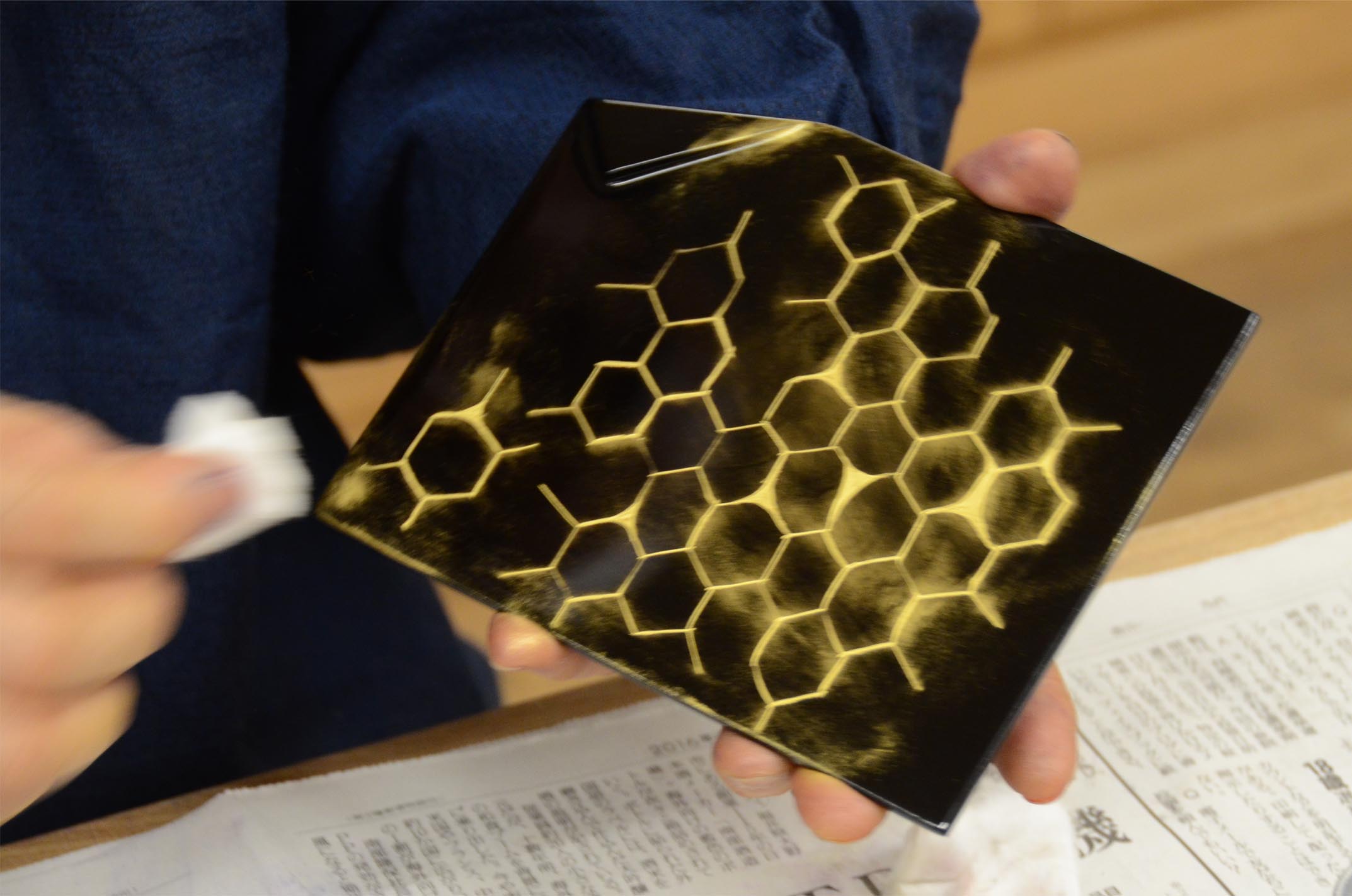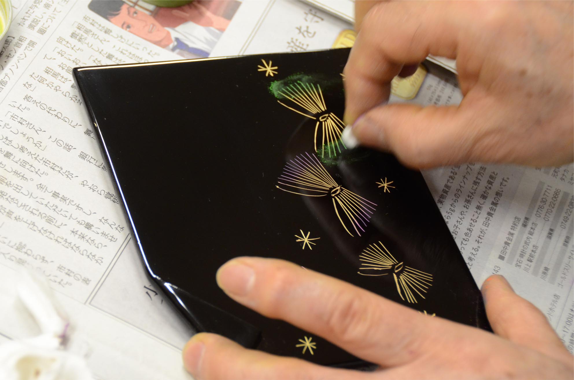 조각한 홈에 옻을 접어 넣어 금가루를 접착합니다.참가자 쪽이 옻나무에 쓰지 않도록, 노리오 선생님이 한사람 한사람의 접시에 금가루를 넣어 주셨습니다. |