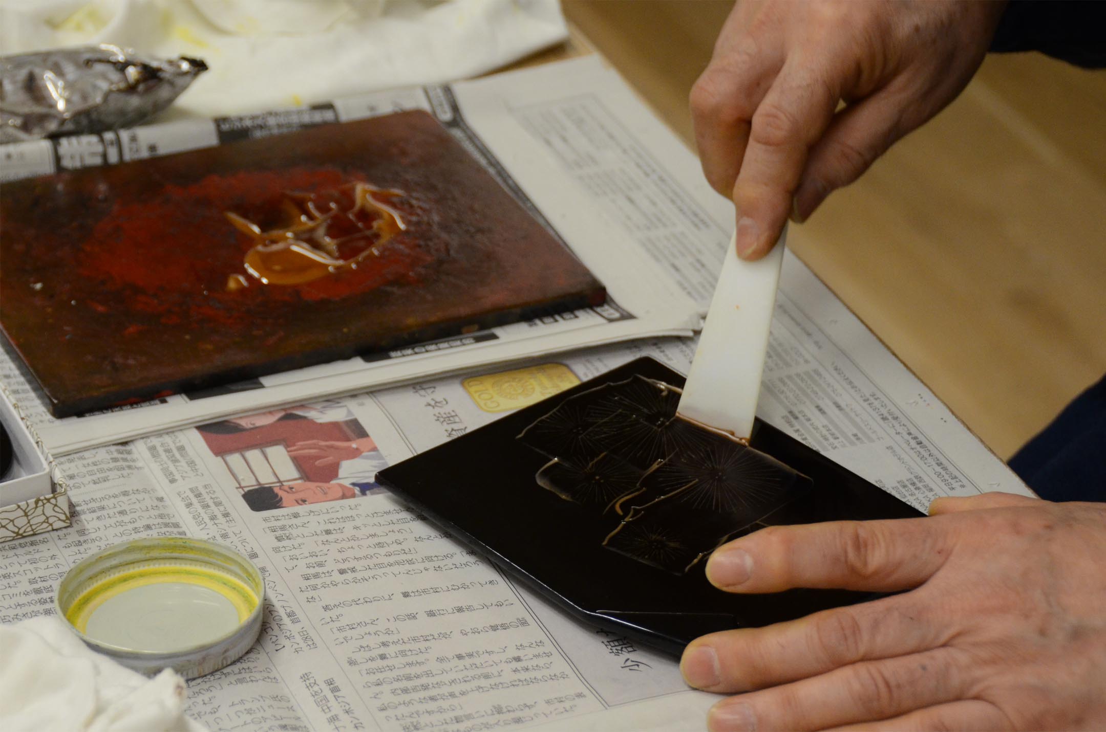 일시 2017년 2월 11일(토) 10:00~12:00, 14:00~16:00 회장 다케나카 목수도구관 목공실 강사 이시모토 아이코·이시모토 노리오(칠예가) 기획전 「칠채 찬가-이시모토 아이코 칠예전-」개최를 기념해 워크숍이 개최되었습니다. 강사는 이시모토 아이코씨와 남편인 노리오씨. |