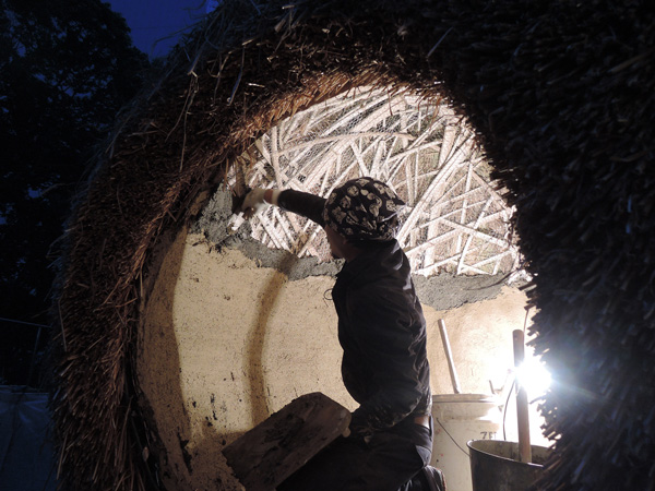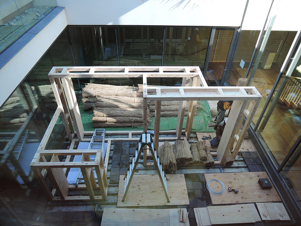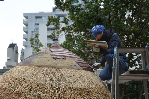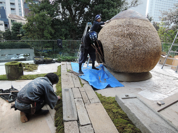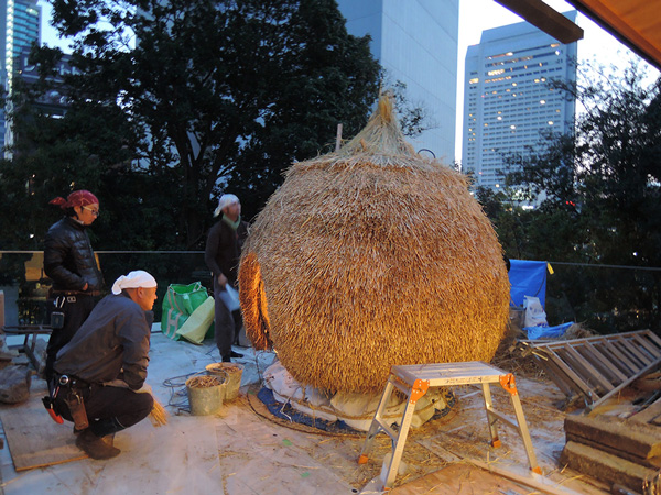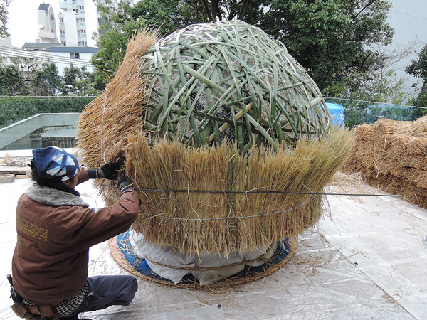 미리 만들어 놓은 대나무 편의 밑바닥을 잡고, 바깥쪽으로 초를 뻗습니다.구체의 초가는 일본에는 없고, 물론 사가라씨도 첫 시도.푸른 납입(일본)은 귀여운 털이 머리에.하지만 이대로는 비가 새어 버리기 때문에, 꼭대기의 마무리를 좌관인 도쿠라씨에게 맡기기로 |