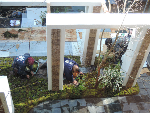 마지막은 야마구치 씨가 이끄는 정원사의 차례입니다.마쓰타케 매화와 차에 관련된 식물(매화, 료브, 쿠마자사, 오카메자사, 소나무)가 배치되어 이끼를 깔습니다. |