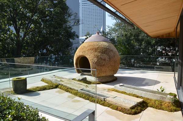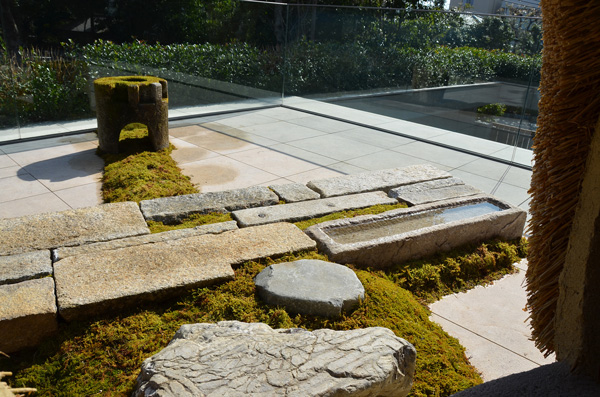 정원석에 찬양된 물이 경치를 비추고 보는 각도에 따라 또 시간에 따라 표정이 바뀝니다.야마구치 씨 왈, 물은 렌즈에 들어오는 여러가지 빛이나 풍경을 나타내고 있다고 합니다. |