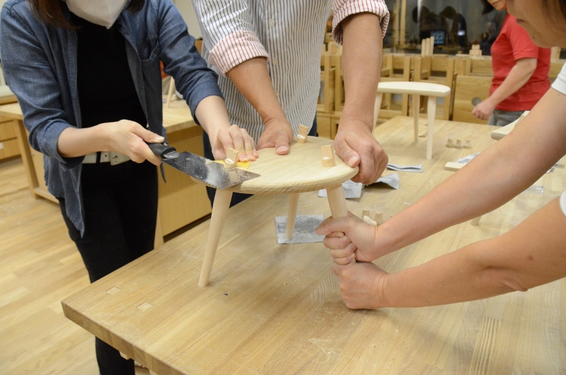 드디어 짜깁니다.이때도 3인 1조.구멍과 다리에 목공 본드를 붙이고 나서는 재빠르게 다리를 구멍에 넣고 위에서 쐐기를 박고 고정합니다.좌면에 나온 다리와 쐐기(쿠사비)는 톱(톱)으로 절단.여기까지 오면 각 테이블 여러분, 마치 전우처럼 호흡이 딱 맞습니다. | ![]() |