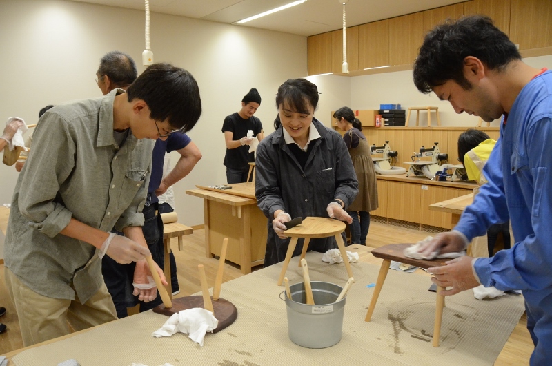 좌면이 깨끗해지도록 냄비(대패)로 마무리한 뒤 마지막엔 도장 작업「칠 남기가 없도록!」라고 강사의 지도가 들어옵니다.도장을 닦아 샌드페이퍼를 걸어 완성샌드페이퍼걸이는 각자 어디까지나 고집되므로 좀처럼 끝나지 않습니다. | ![]() |