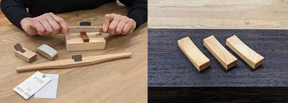 히노키를 대패 모양을 한 사포 딸린 나무 도구로 보고 새겨 놓는 것을 2개 만듭니다