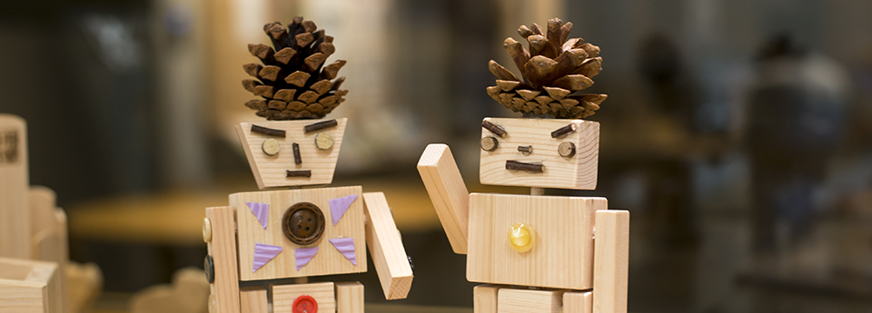손발도 움직이는 나무로 만든 로봇입니다.소나무와 작은 가지로 데코레이션합니다.