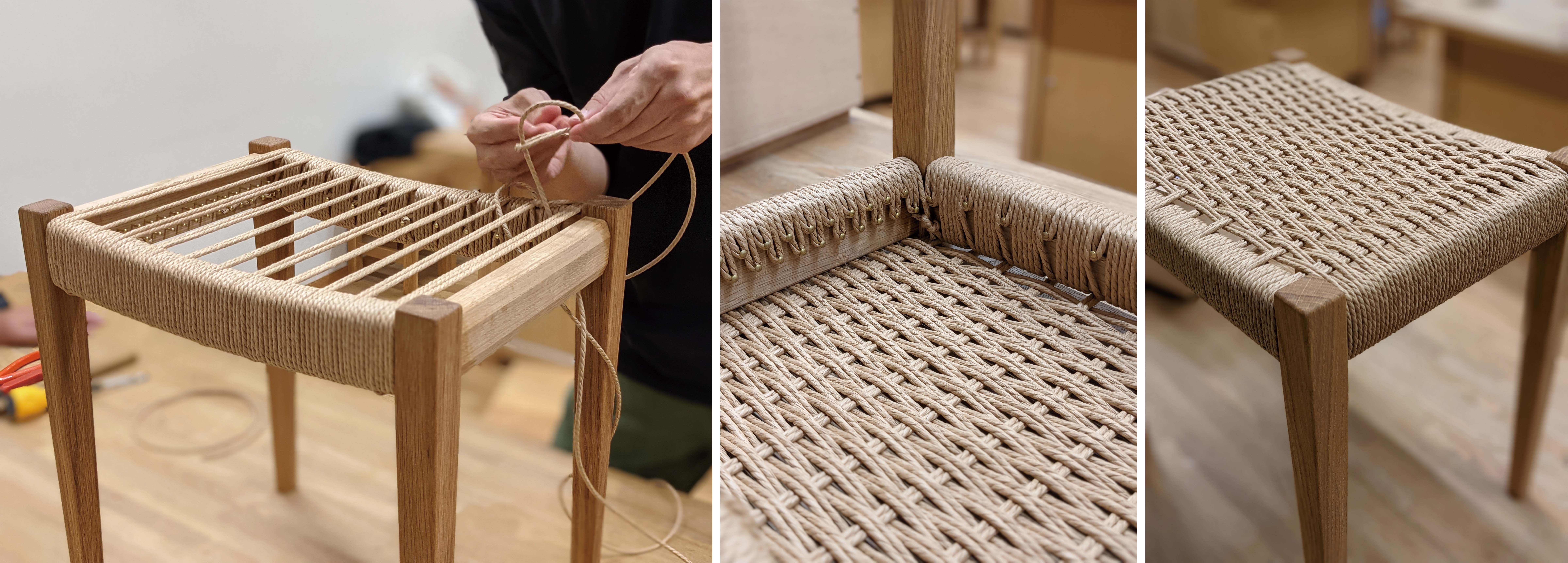 원래 농 작업용 등에 사용되고 있던 덴마크제 페이퍼 코드(종이 끈)을 사용하여 오크 또는 화이트 애쉬의 스툴 테두리에 좌면을 짜깁니다.