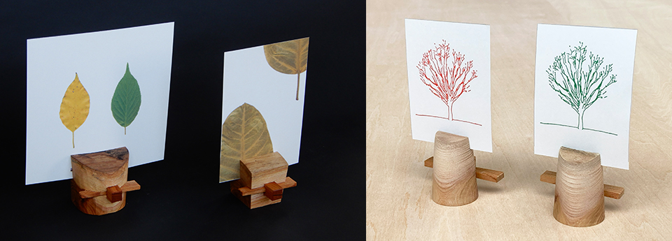나뭇가지를 사용해 카드 스탠드를 2개 제작합니다.톱, 끌, 대패에서 부품을 가공하고 카드를 「꼬마비」로 끼우는 구조에 임합니다.