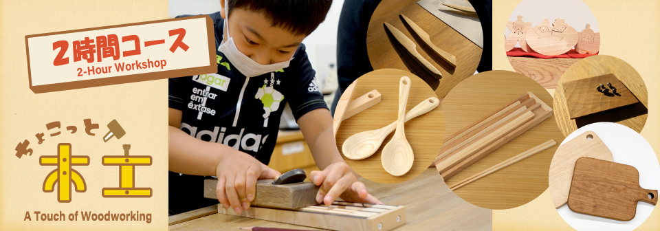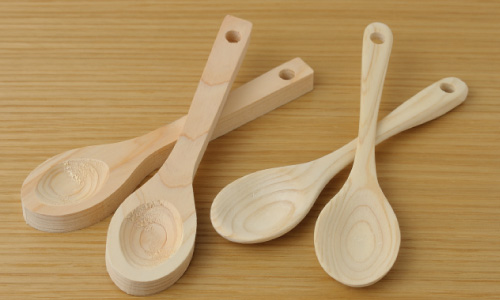 편백나무 숟가락이나 네모 접시 등 2시간 코스의 6종류의 공작 만들기 키트 중에서 1종류 골라 좋아하는 것을 만들 수 있습니다.