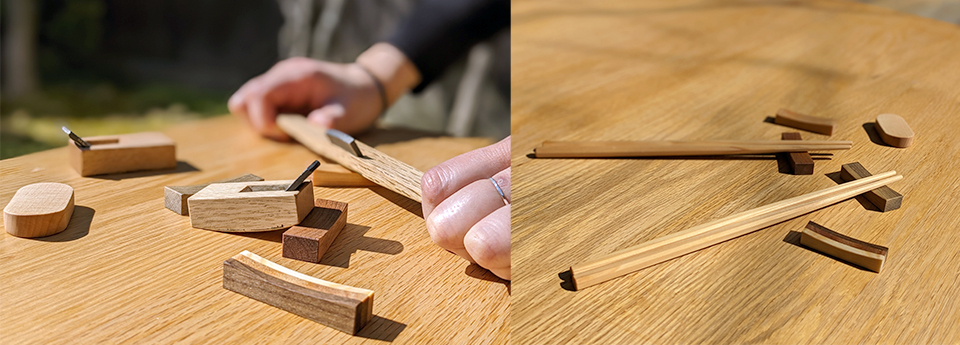 노송나무의 젓가락과 적층의 젓가락을 만듭니다.