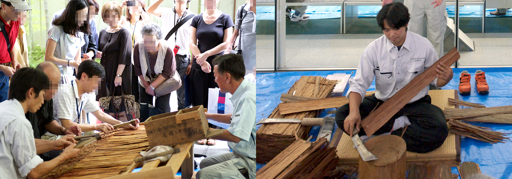 장인의 지도 아래, 히노피 푹신 지붕의 모형에, 히노라의 껍질을 한 장씩 정중하게 거듭해, 대나무 못을 지붕 망치로 한 개 한 개 박아 고정하는 작업을 체험해 주십니다.또 숙련의 장인에 의한 히노피를 재료로서 정돈하는 작업이나, 초가(코케라부키)에 사용되는 얇은 판을 한 장씩 나누어 만드는 모습도 보실 수 있습니다. 평소에는 볼 수 없는 전통 기술의 세계를 가까이서 꼭 봐 주세요.