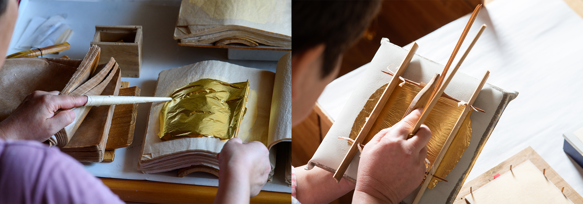 가나자와에서 생산·판매되고 있는 금박에는 전통 공법으로 제조되는 연부 금박과 카본을 도포한 글라신 종이를 사용해 제조되는 근대 공법의 단절금박의 2종류가 있습니다.전자의 연부 금박은, 400년 이상 전부터 행해지고 있는 전통적인 기법에 의해 시간과 수고를 걸어 만들어져, 국보나 중요 문화재의 복원에는 반드시라고 해도 좋을 정도로 이 금박이 이용되고 있습니다.또한, 그 제조의 특필해야 할 점으로 수제 종이를 사용하는 것을 들 수 있습니다.양질의 금박을 제조하는 데 가장 중요하며, 이 종이를 만드는 것이 가장 중요하며, 금박 일의 대부분은 이 종이 제조에 사용됩니다.