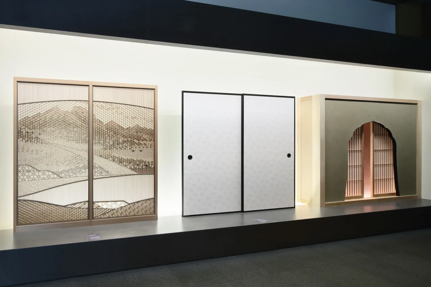 일본의 전통미:왼쪽부터 조자 세공의 장자, 당지의 멧, 녹벽 마무리의 화등창
