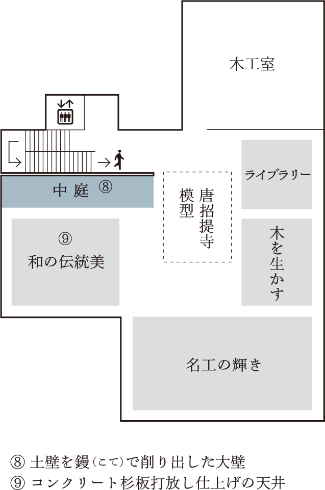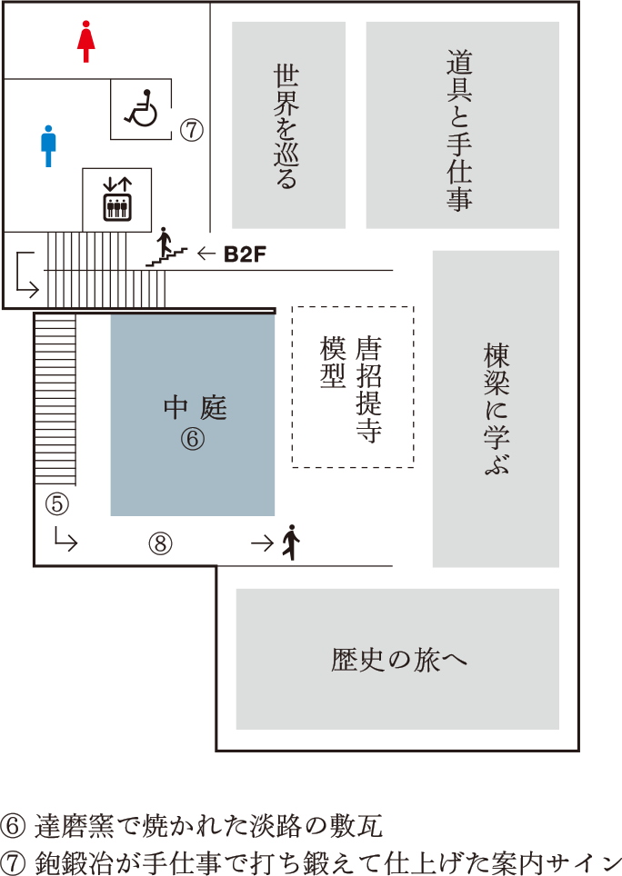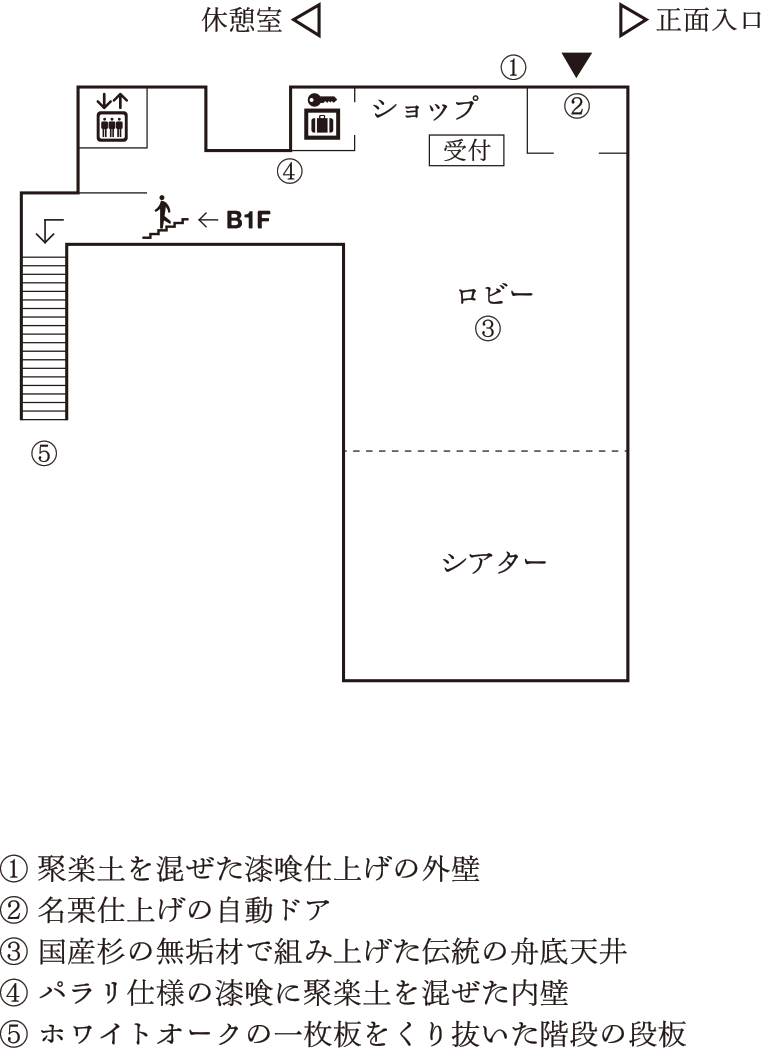 휠체어, 유모차로의 입장에 대해 계단 근처의 슬로프에서 입장하시면 편리합니다. 1층 계단 동쪽에 엘리베이터가 있습니다.