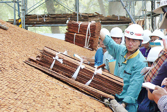 원조지 다이몬은 무로마치 시대의 건물로, 훌륭한 히노피가 있습니다.히노피 푹신재는 지붕의 어느 부분에 사용되는지에 따라 다른 형태를 하고 있습니다.각 종류에 대해 정중하게 설명해 주셨습니다.