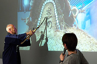 히로야마씨가 이끄는 이바라키의 장인씨들에게 제작해 주신, 기획전 회장의 초가 지붕에 대해서, 해설해 주셨습니다.쓰쿠바류의 지붕은 동의 소구(키리토비)의 장식이 훌륭하고, 장인의 팔 모양소입니다.이 「스」의 글자는, 가위로 침입한 위에서 먹을 넣고 있다고 한다.낡은 초가 민가의 키리토비는 학, 마쓰타케 매화, 물에 거북, 등 다양한 종류를 볼 수 있다고 합니다.