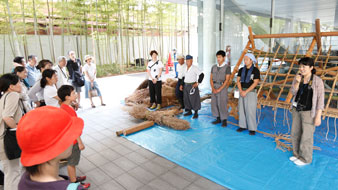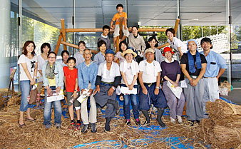 기획전[푹-풀과 나무로 만드는 지붕-]의 개최를 기념해, 초가의 체험 교실이 개최되었습니다.강사는, 일본 초가 문화 협회의 우에노씨와, 이바라키현 쓰쿠바 지방의 초가 장인씨들장인씨의 지도 아래 “쓰쿠바류”의 초가에 도전입니다!
