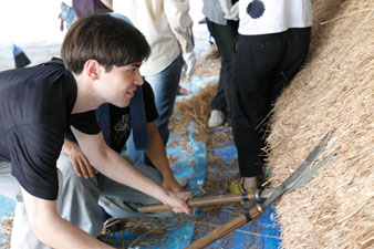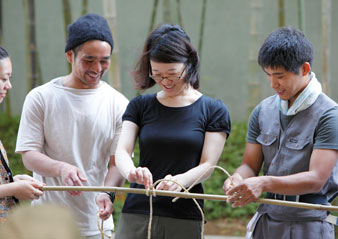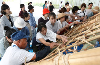 지붕 밑바닥 위에 지치를 두고, 그 위에서 대나무로 누르고 줄을 통해, 한층 더 「다리」를 사용해 지오를 기초에 확실히 고정합니다.이것은 쓰쿠바 지방 특유의 「토오시모노」라고 불리는 고정 방법.숙련된 장인 씨는 다리를 내려놓을 때의 기세와 유연성이 대단하다!(참가자 여러분, 고전 중)
