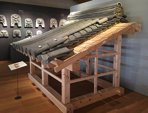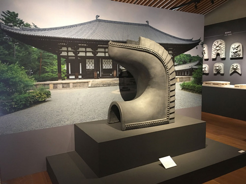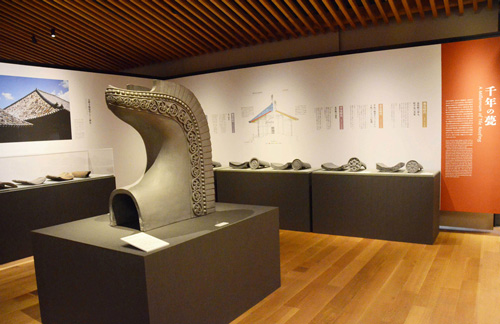 천년의 신(기와의 역사) 코너입니다.중앙의 스테이지에는 흥복사 중금당의 치미(치수의 1/2), 그 왼쪽 안쪽에는 지붕을 타고 있는 현역 기와에서 가장 오래된 1400년 전(아스카시대) 원흥사의 기와를 전시하고 있습니다.또한 패널에는 건축의 변화와 기와의 관계를 설명하고 있습니다.