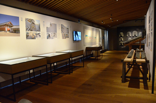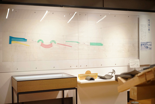 지붕 모형의 맞은편에는 기와 장인이 그린 원치수도지붕에 기와가 어떻게 들어가는지를 검토하기 위해 실제 기와 크기로 도면을 그려 확인하기 위한 것입니다.원치수도를 그리기 위한 형판이나 발굴한 기와를 측정하기 위한 도구도 전시하고 있습니다.