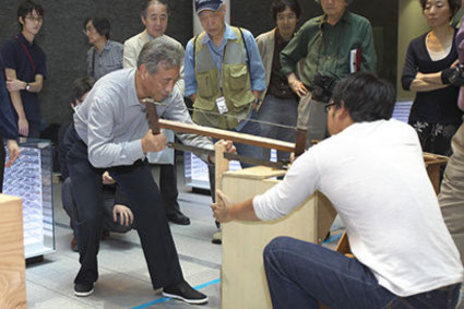 계속해서, 드디어 도구를 사용한 실연입니다.우선은 구석의 나루목을 만드는 기술에 대해 소개하겠습니다.판상의 재의 표리에 쓰여진 묵선에 맞추어 톱으로 비스듬하게 자르는 것으로, 조금씩 각도가 다른 부재가 효율적으로 완성되어 갑니다.이번에는 작은 모형으로 재현.앞의 묵선을 확인하기 위해서, 테두리 톱을 둘이서 사용합니다.동량과 참가자의 공동 작업입니다.