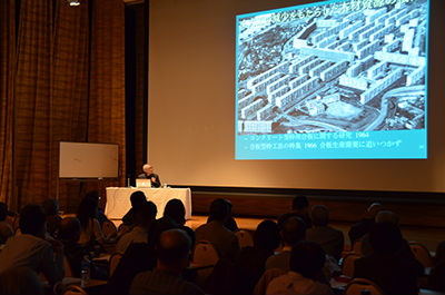 최초로 강연된 것은 후지모리씨.벽돌 슬레이트·철근 콘크리트 기술에 대해서 사진과 즉흥의 일러스트를 사용해 해설되었습니다.화이트 보드에 그리고 있는 것은 벽돌을 연속적으로 구워 가는 호프만 가마입니다.