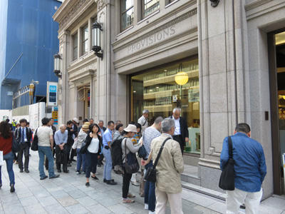 최초의 견학처는 2013~15년에 개수 공사가 행해진 메이지야 교바시 빌딩(1933년 준공)우선 시미즈 건설 본사 빌딩의 홀에서 슬라이드를 사용해 개요를 소개해 주셔, 현지로 이동해 외관을 견학했습니다.