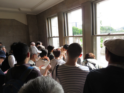 계속해서 도보 15분 정도 이동하여 「자료로 보는 근대 건축의 걸음」전에서도 자료를 전시하고 있는 메이지 생명관(1876년 준공)의 견학입니다.여기는 2001~05년에 행해진 보존·재생 공사를 담당된 나카지마 토오루씨(다케나카 공무점)에게, 수리를 통해 알았던 쇼와 초기의 기술이나, 수리의 고생 등을 이야기해 주셨습니다.
