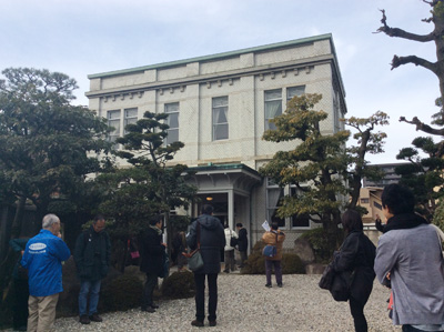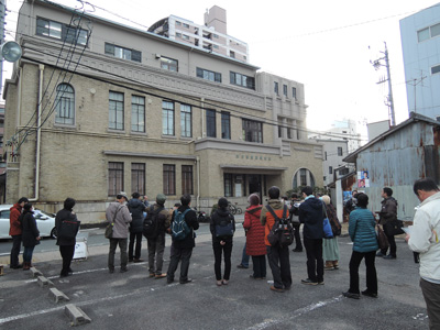 2월 6일, 「나고야의 근대 건축을 둘러싼」라고 제목을 붙인 견학회를 개최했습니다.시라카베 지구 주변에 남는 근대 건축을 둘러보는 기획입니다.강사는 오사카 역사 박물관의 사카이 이치코씨와, 다지미시 모자이크 타일 박물관 담당의 무라야마 칸씨.근대 건축으로서의 위치를 사카이씨가 해설해, 외장·내장으로 다용되는 타일에 대해서 무라야마씨가 한층 더 해설한다고 하는 형태로 진행되었습니다.