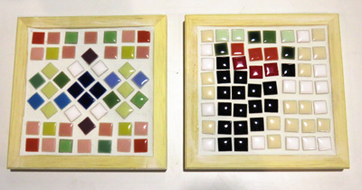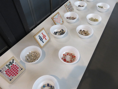 이번에는 1cm 모퉁이의 타일을 늘어놓고 10cm각의 모자이크 아트를 만드는 약 2시간의 프로그램.여기가 이번에 사용하는 타일과 완성 견본입니다.