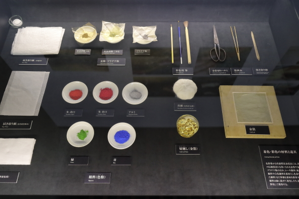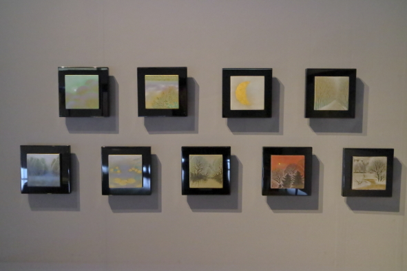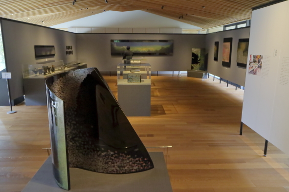 본전에서는, 일본 알프스 등의 정경을 복칠채의 기법에 의해 표현한 패널 작품이나 오브제, 그릇 등의 작품을 전시하는 것 외에, 제작 도구, 공정을 수록한 영상을 소개합니다.