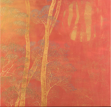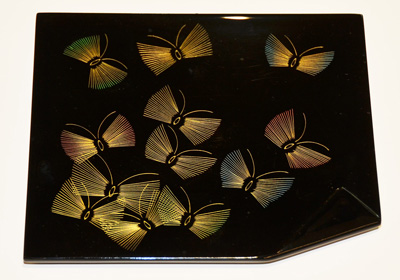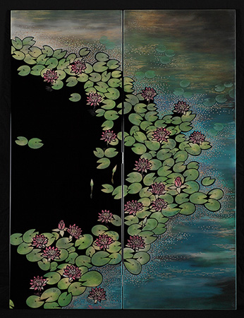 옻칠의 소지에 문양을 조각해 금박·금가루 등을 접어 장식하는 침금(친킨)은 칠공예의 전통적인 가식 기법의 하나입니다.칠예가·이시모토 아이코는 침금의 전통 기술을 살려, 색채 풍부한 복칠채(후시사이) 침금 기법이라고 하는 새로운 수법을 확립했습니다.