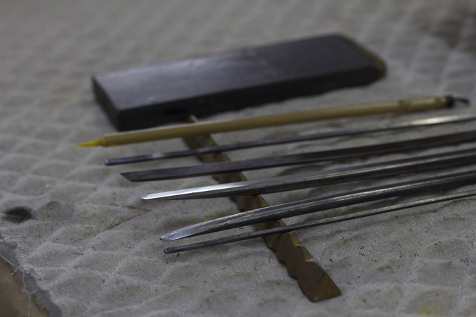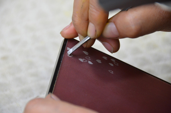 12.5×15cm의 칠과자 접시의 표면을 침금도로 조각해, 모양을 그려내는 섬세한 공정을 체험합니다.