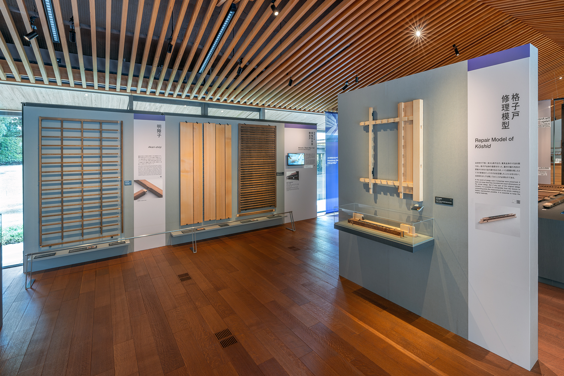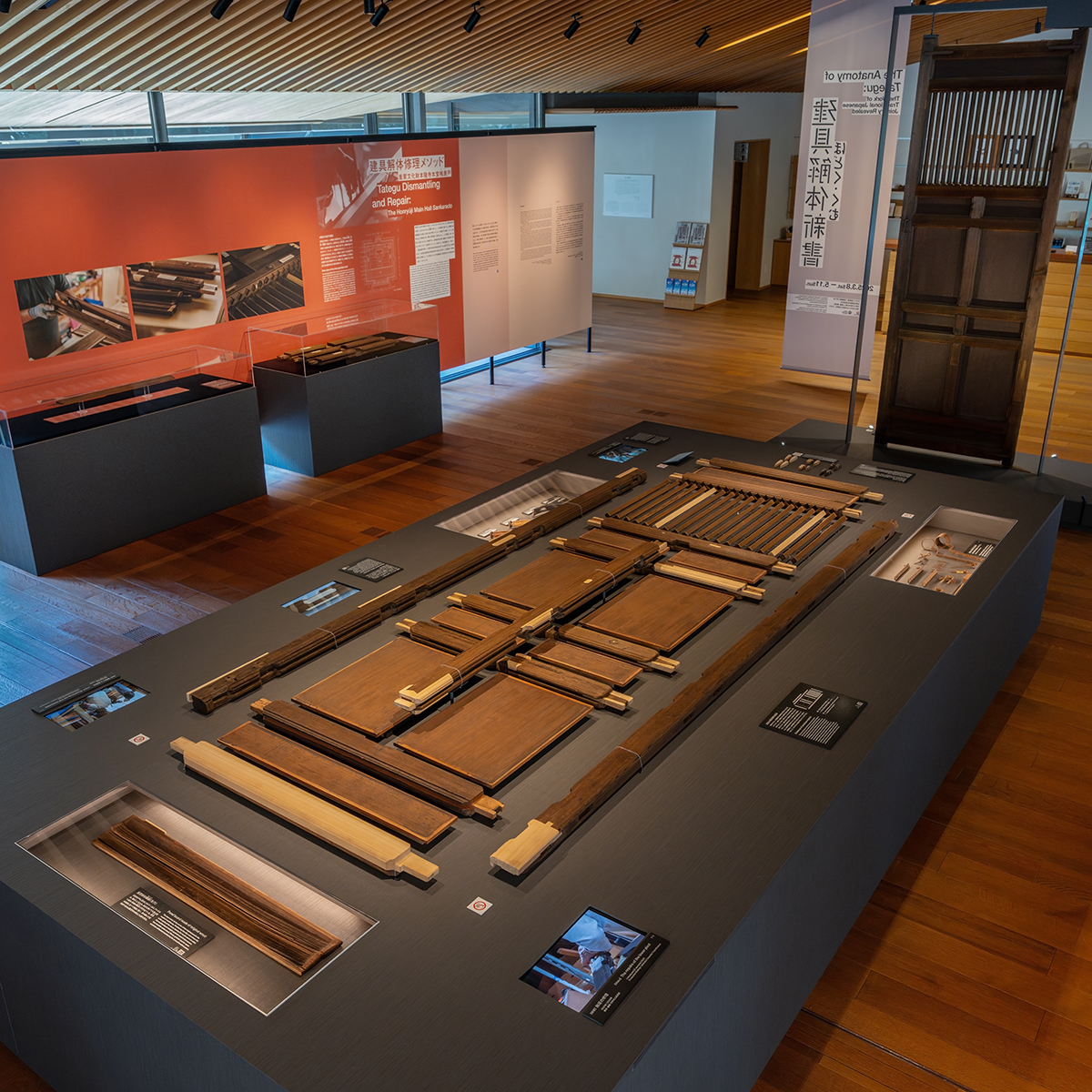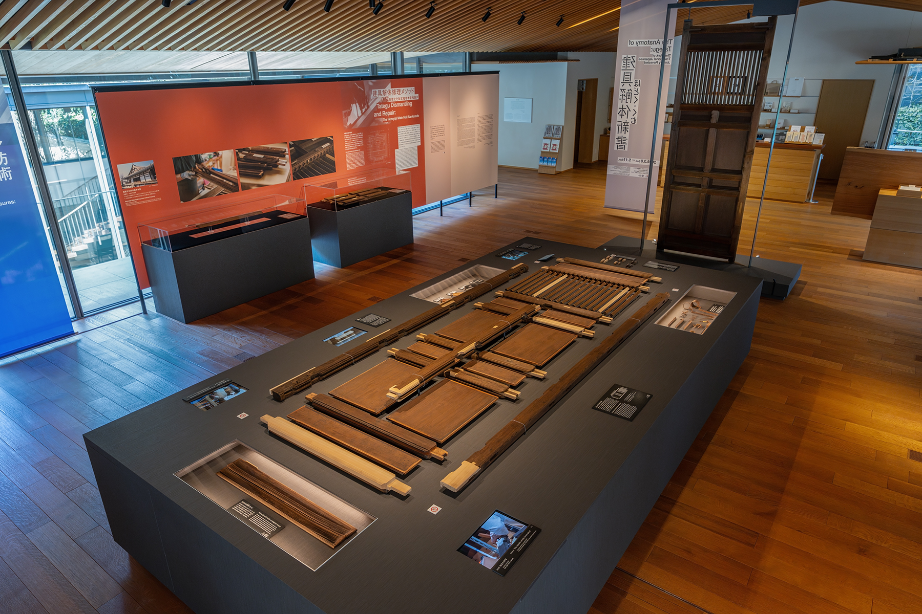 본전에서는 해체함으로써 보이는 창호의 내부 구조와 손상된 재물을 보수하고 기능을 재생하는 수리기술에 착안해 유네스코 무형문화유산 ‘전통건축공장의 기술’을 구성하는 ‘창호 제작’의 전통기술에 깊이 수술합니다.보이지 않는 곳에야말로 일을 집중시키는 창호의 진수를 봐 주세요.