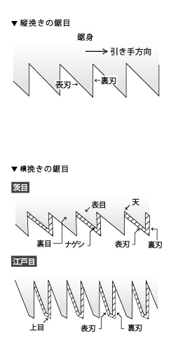 요코비키의 톱은 좌도와 같이, 상칼·뒷날의 표가 예리에 깎여져 있어(나게시), 코도와 같이 나무의 섬유를 절단하는 구조가 되고 있습니다.각 치아는 교대로 좌우를 마주하고 있습니다.또 세로만 톱과 같이 바지를 붙입니다. 톱에는 몇 가지 종류가 있습니다.간단한 만들기의 이바라키에 대해, 에도메는 그림과 같이 첨단을 한층 더 야스리로 갈아입고 상목을 번 것입니다.