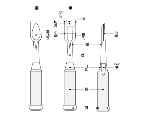 낚시에는 다양한 종류가 있지만, 용도에 따라 크게 두드리기(타타키만)과 마무리로 나눌 수 있습니다.두드리는 현능이나 망치를 사용해 호조 구멍을 파거나 겨드랑이를 깎을 때 사용하는 것으로, 튼튼하게 만들어져 있습니다.또 두드려 사용하기 위해, 무늬의 머리 부분에 관(가발)이라고 불리는 철제의 고리를 붙여 사용합니다.마무리 짓는 매립으로 판 부분의 마무리나 냄비를 걸 수 없는 세세한 부분의 마무리에 이용하는 것으로, 완력만으로 깎기 때문에 무늬가 길고, 칼끝도 예리하게 되어 있습니다.