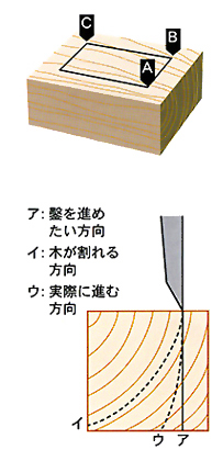 끌을 사용할 때에는 대상이 되는 재의 성격을 생각해 사용하는 것이 중요하다.호조굴을 파는 경우, 나뭇결을 생각하고 끌의 종류와 더하는 힘을 구분한다.나뭇결을 절단할 때(오른쪽도 A~B)에는 이삭의 두꺼운 끌을 이용하고, 나뭇목을 따라 묶을 때(B~C)에는 이삭 폭이 넓은 광착을 사용하여 먹 밖까지 갈라지지 않도록 주의해 두드린다.또 우도처럼 재의 앞쪽에 주의해 깨지는 방향을 예측하면서 끌을 진행한다.
