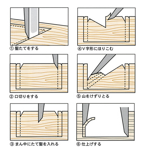구멍이 파는 절차는 밑그림처럼 먼저 먹을 따라 묶어서 거기에서 조금 안으로 들어간 부분부터 말 잘라 파기 시작한다.이것은 처음부터 먹을 따라 강하게 치면 절날에 압박되어 구멍이 필요한 크기보다 커져 버릴 수 있기 때문이다.다음에 중앙에 칼을 넣어 V자형으로 파는다.마지막으로 사상 끌로 먹을 따라 정중하게 깎아내다구멍 파는 일에서 주의해야 할 점은 구멍의 위치와 형태가 항상 올바르게 되도록 재의 진묵을 의식하면서 파내는 것이다.큰 재에서는 구멍이 구부러지지 않도록 항상 자 등으로 확인을 게을리하지 않는 것이 필요하다.