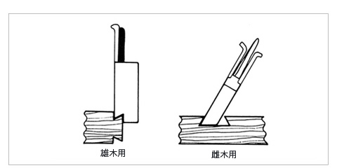 개미 모양의 부분을 깎는 데 사용한다.대의 아래쪽 끝을 칼날 폭의 분만 비스듬하게 단결한, 볼록형의 부분을 깎는 것과(웅목용), 바닥 결속 다른 하단을 비스듬으로 한 형태의 부분을 깎는 것(암목용)이 있다(도 4).수목용에는 나사식 자가 붙어 칼날 폭, 즉 개미무늬의 깊이를 조절할 수 있는 것도 있다.수목용, 암목용 겸용의 부부 개미결 냄비도 고안되고 있다.