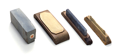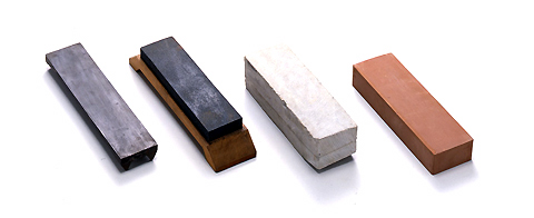 각종 갈기 도구 왼쪽부터 천연 중토, 천연 물건, 곡면용 지토이시 2점