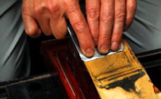 금반(가나반)은 철제의 평평한 판으로, 낚시와 냄비의 뒷밀에 사용합니다뒷밀기는 칼날 뒷면을 정확한 평면에 갈라놓는 것으로, 칼이 곧게 끊어지도록 하기 위해서는 빼놓을 수 없는 작업입니다.뒷부름은 금반 위에 금강사를 소량 얹고 물방울을 넣고 뒷날을 갈고 닦습니다금강사의 입자를 점차 세밀하게 만들어 갈기 상처를 떨어뜨려 갑니다.마지막으로 금강사를 씻어 내고, 마무리 지수로 갈라집니다.