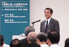 내용은, 하코칸 봉행소 복원 공사의 착공으로부터 완성까지의 공사 경과의 이야기입니다.회장에는 140명의 손님이 참석했습니다.